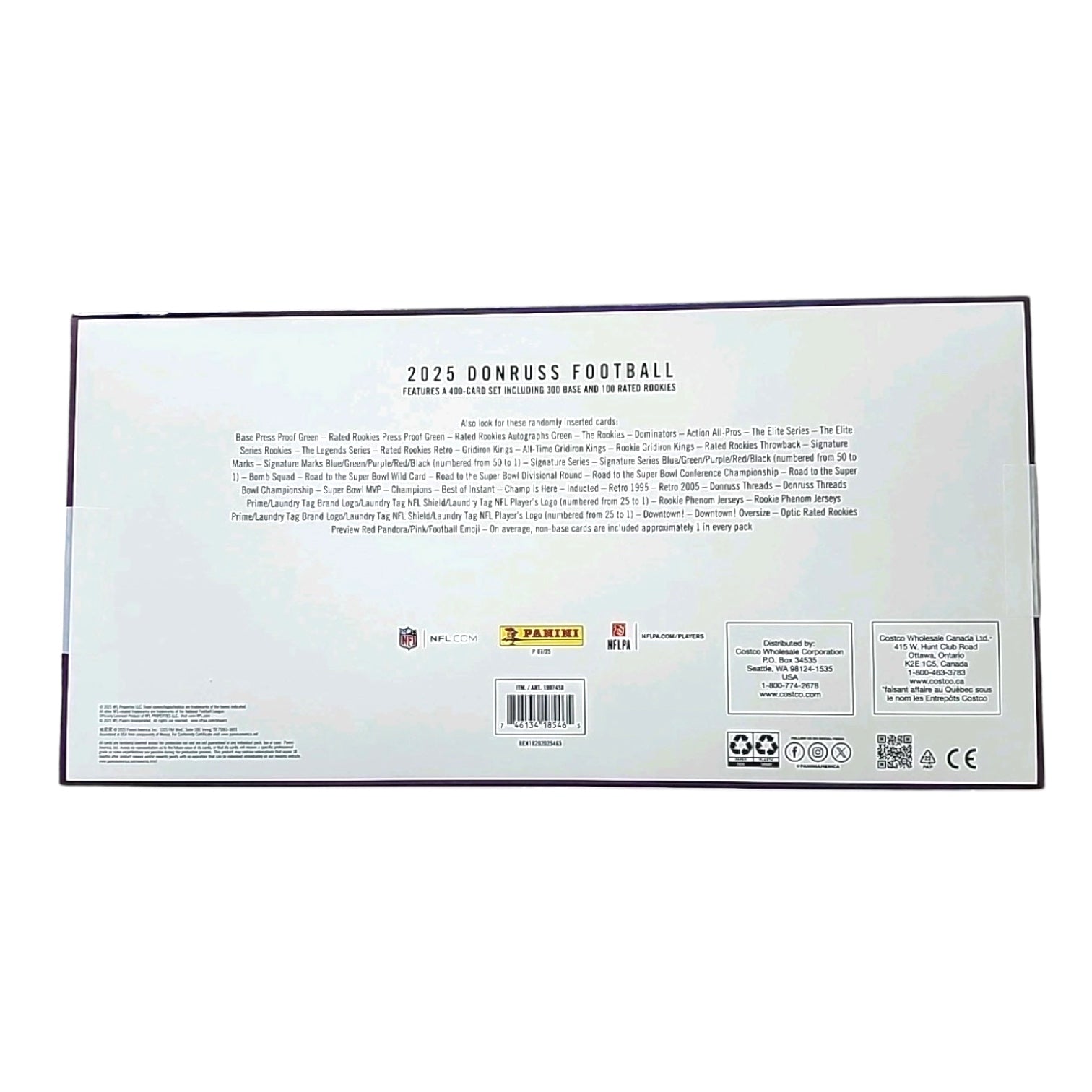 The 2025 Panini Donruss Football Costco Bundle Box is a brand new factory sealed box containing sports trading cards featuring football players. This set, known for its Downtown card, offers collectors a unique and exclusive collection of cards from the 2025 season. The box is manufactured by Donruss, a reputable company known for producing high-quality sports trading cards, making this bundle a desirable item for football fans and collectors alike.
