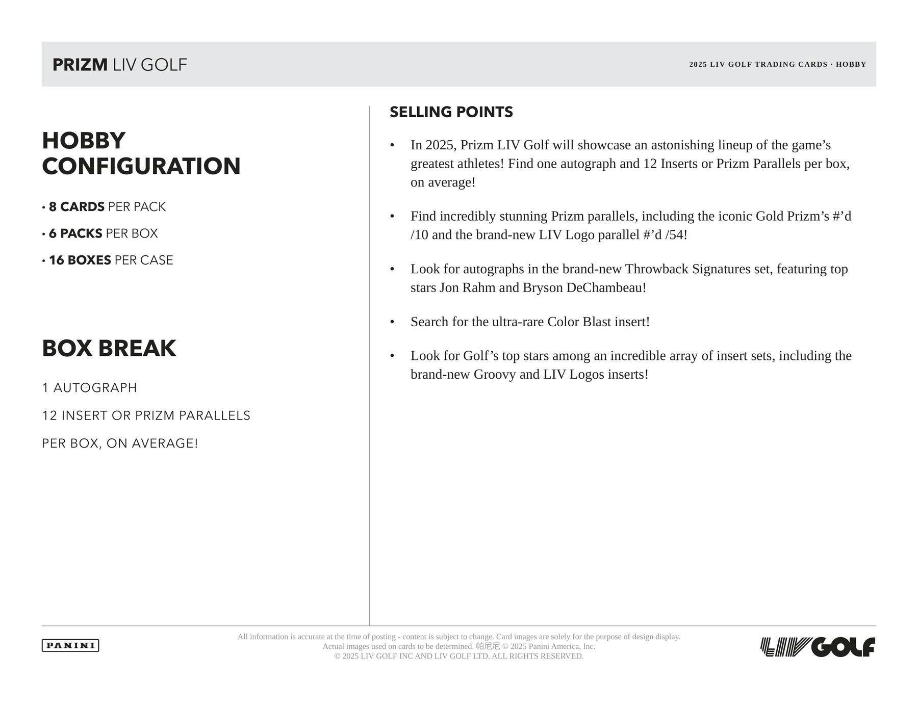 In 2025, Prizm LIV Golf will showcase an astonishing lineup of the game's greatest athletes! Find one autograph and 12 Inserts or Prizm Parallels per box, on average!